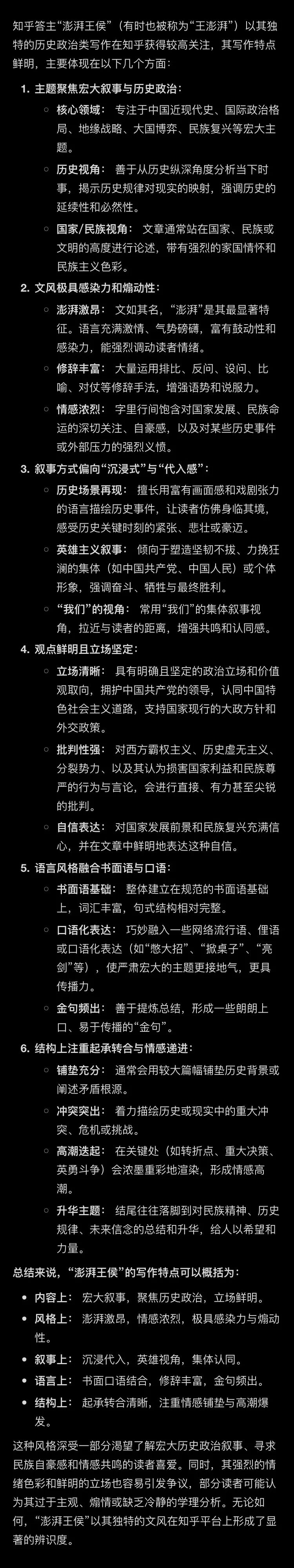 咱们来现场举个例子,我找 AI 去问下我自己,指令是:**知乎答主"澎湃王侯"有哪些写作特点?**看它是怎么回答的: