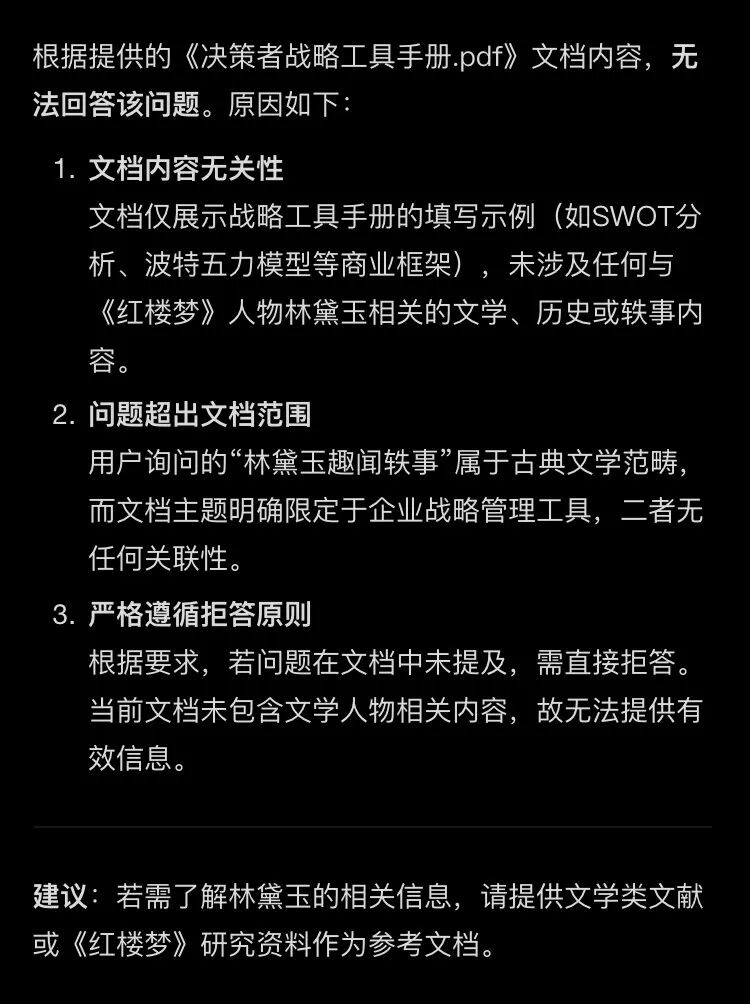 我们自建知识库,就是为了使 AI 给出的回答,限定在知识库这一范围之内,这样才能确保结果的含金量。