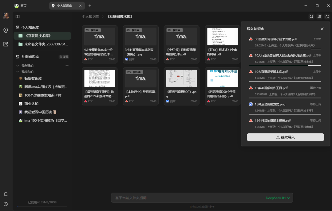 我们可以不用之前介绍的各种电子笔记软件了,而是把海量的文档资料直接"投喂"给【ima】即可,剩下的就是: