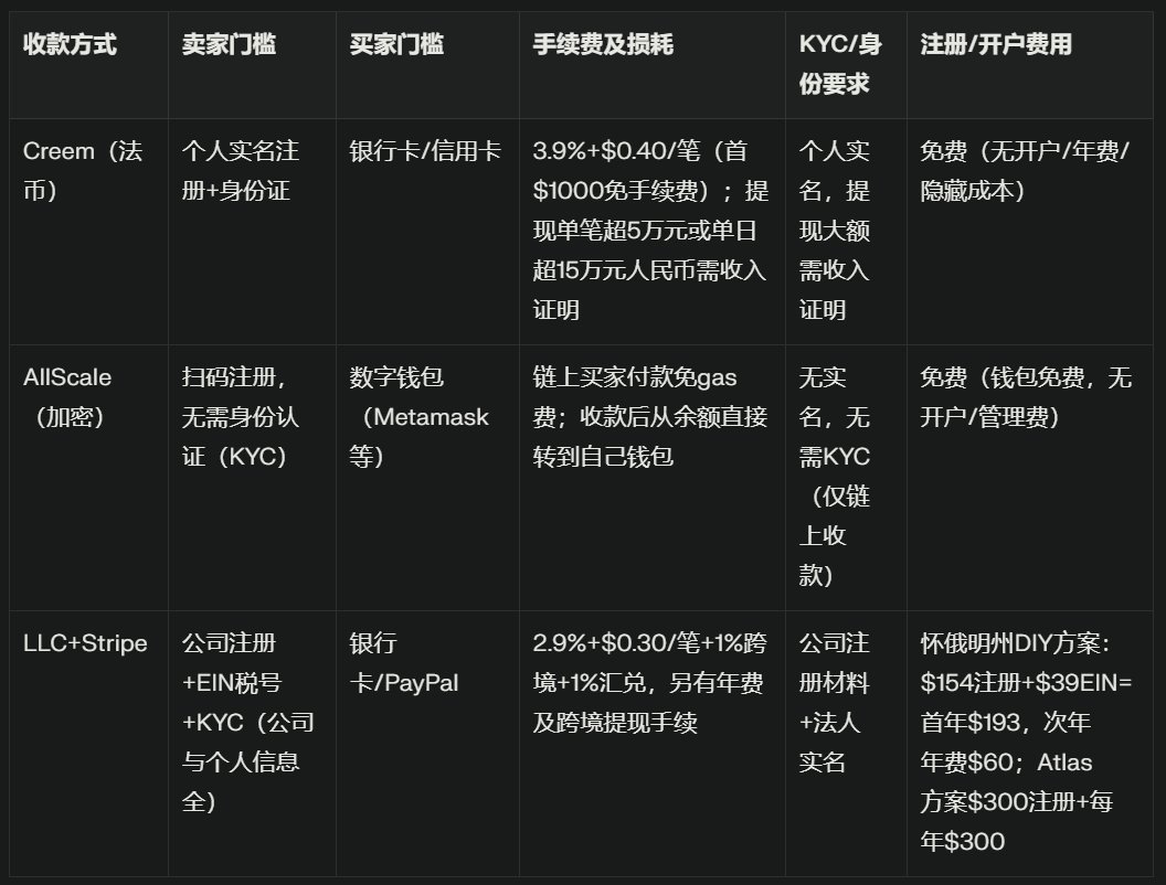 A:个人法币收款: Creem大陆用户可开通,无年费,但每笔手续费较高(每笔3.9%+$0.4),大额提现要收入证明;