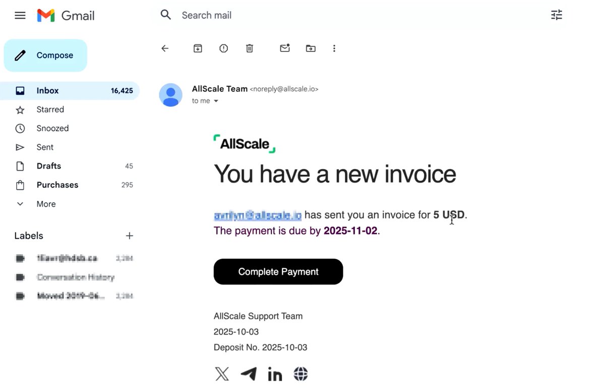4、#AllScale加密收款操作指引 A、进入官网注册:https://dashboard.allscale.io/pay/register?code=XbNq37TmgTRUilfP1Ljx9r0LUjCJGLGuaB25S9qfB0hDLXzUrtxJF5ya83zuTdNDSNuR3A==…,输入邮箱,出现Passkey需扫码 B、手机默认相机扫码,点击相机内链接授权 C、进入后台后创建invoice订单发到买家邮箱 D、买家点击右键使用数字钱包(如Metamask)支付USDT E、你收到钱,可转出到自己数字钱包