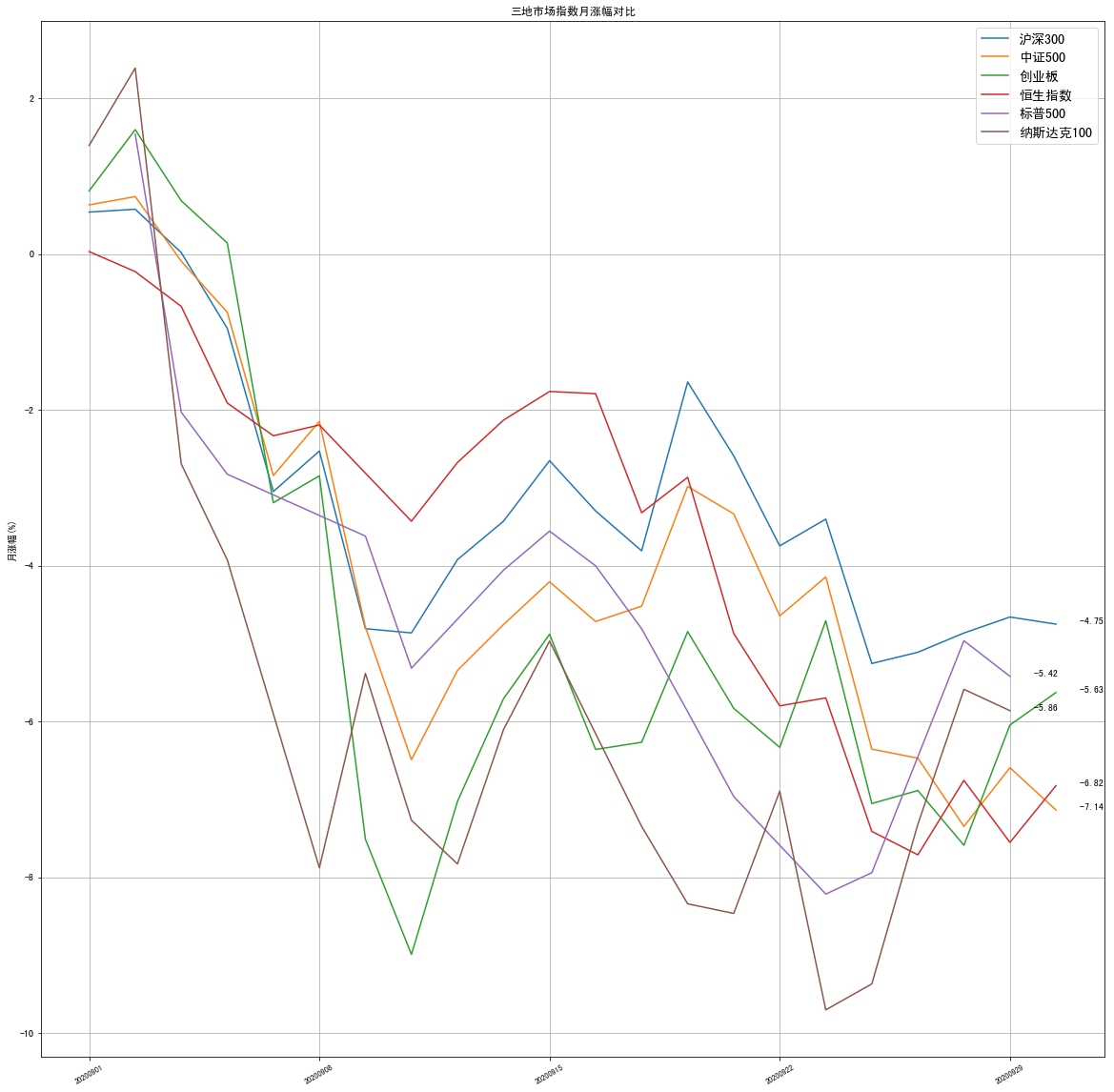 本月市场大幅回调。三地市场宽基指数均产生了超过5%的下跌,市场在经历很高的涨幅且横盘一段时间后终于选择了向下的方向。