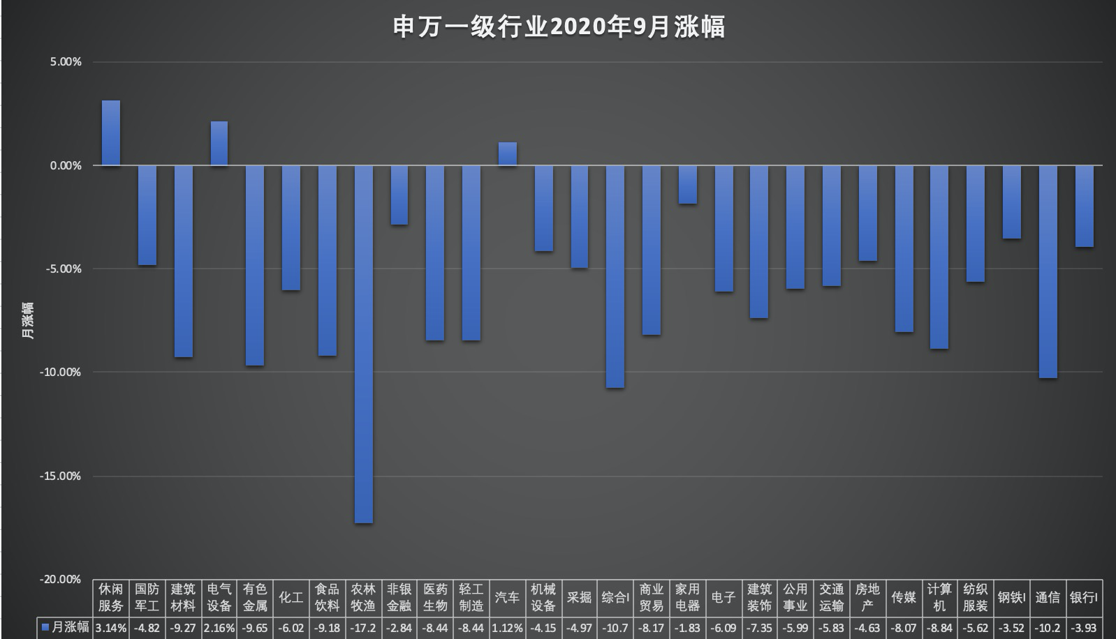 从申万一级行业板块月涨跌幅看,本月大多数板块产生了超过5%的跌幅,这也和市场的跌幅差不多。