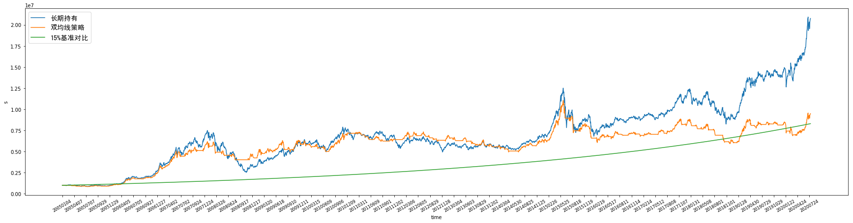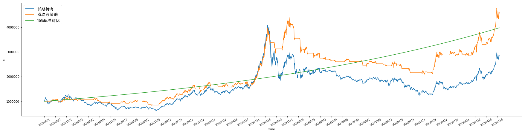双均线策略,通过建立m天移动平均线,n天移动平均线,则两条均线必有交点。若m>n,n天平均线“上穿越”m天均线则为买入点,反之为卖出点。该策略基于不同天数均线的交叉点,抓住股票的强势和弱势时刻,进行交易。