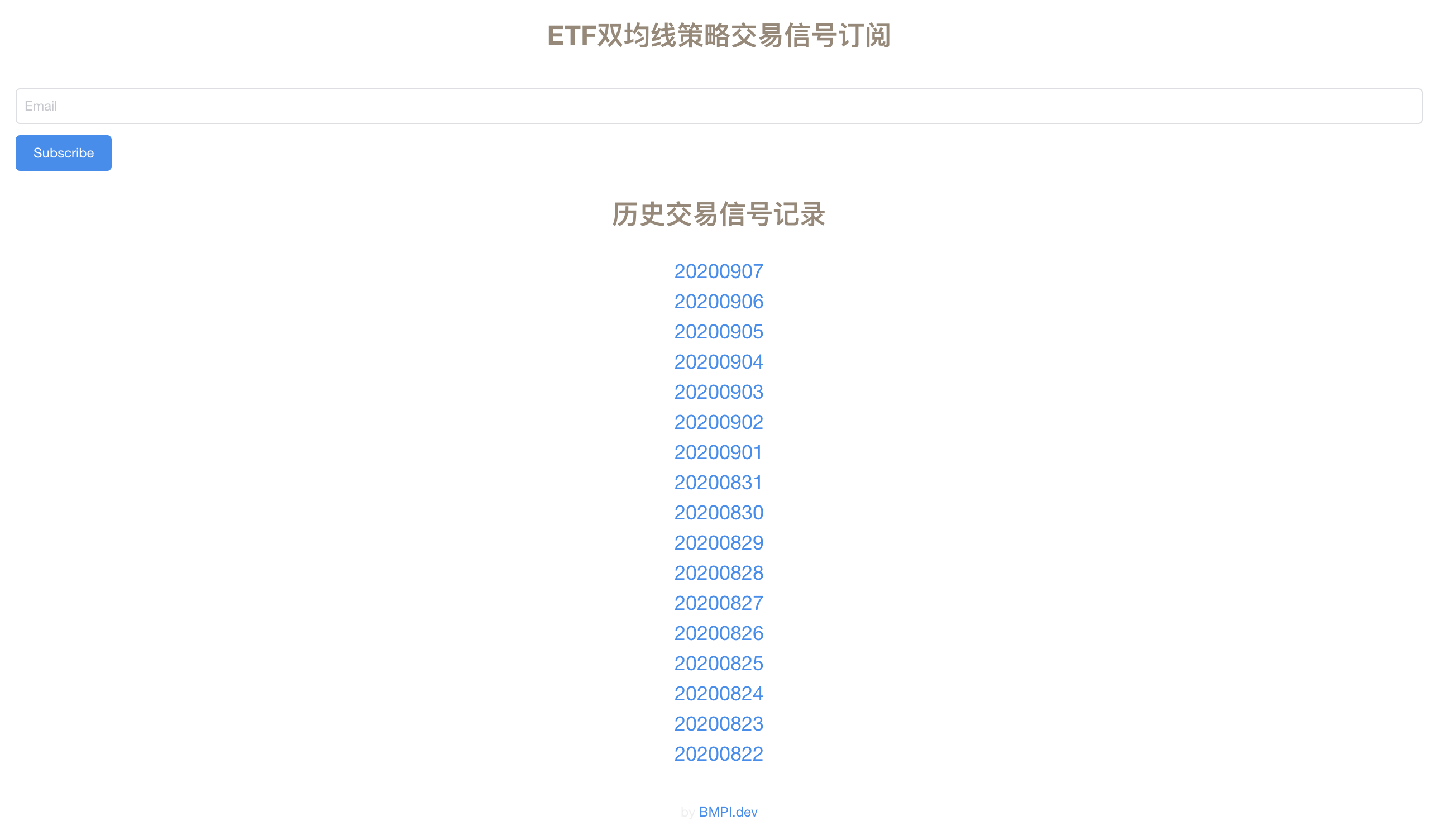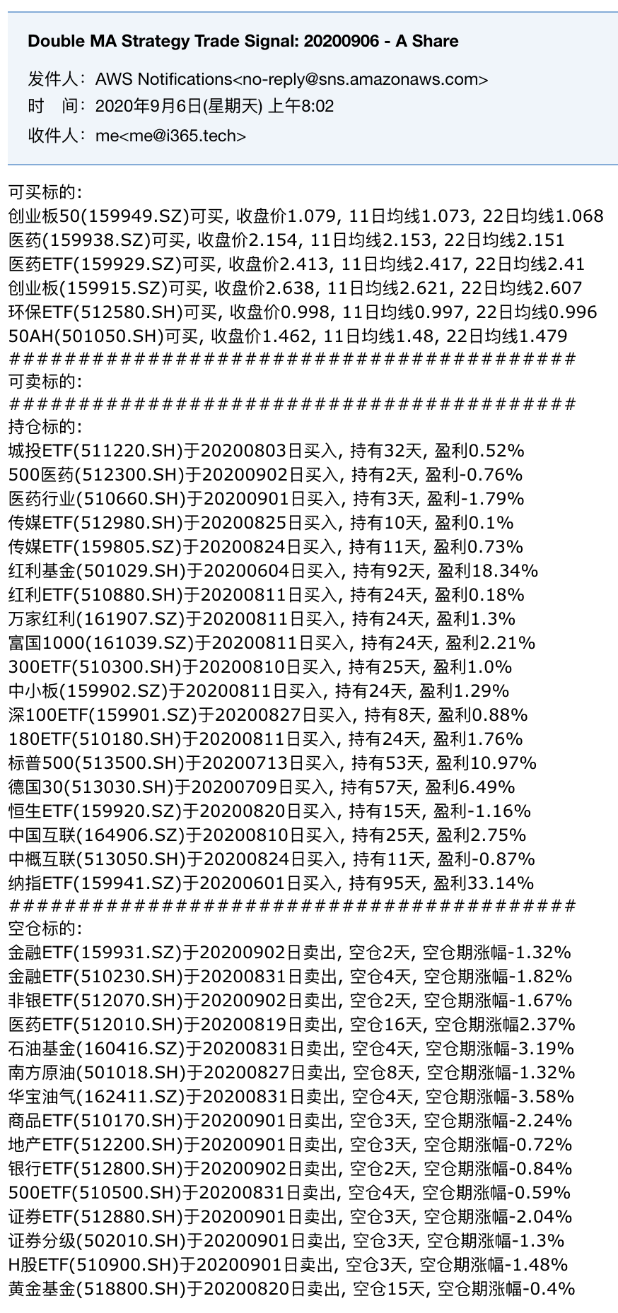 当你邮件订阅后,这个工具会在每日8点时给你发送昨日的指数ETF双均线交易信号,邮件格式如下: