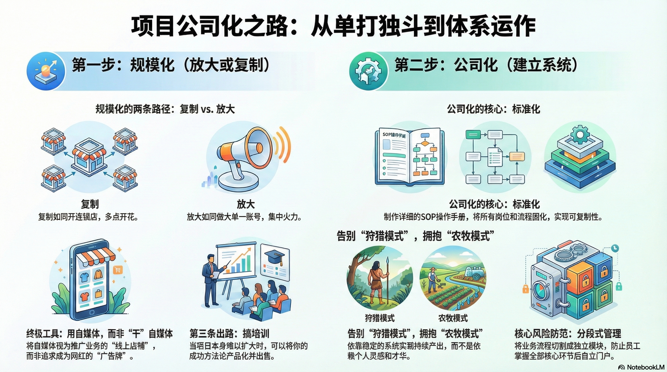 本文详细阐述了如何将一个成功的项目进行 规模化 和 公司化 的策略与步骤。在规模化阶段,作者区分了项目增长所需的 复制 或 放大 途径,并强调 自媒体 已成为实现规模化的核心工具。文章强调应将自媒体视为推广业务的 线上店铺模式,以客户转化为目标,而非狭义上的网红 广告牌模式。通过对比早期创业环境的艰辛与风险,来源论证了当前智能推荐平台提供的获客便利性是前所未有的时代红利。要实现公司化,其核心在于 标准化,即通过创建详细的行政和业务 SOP 手册,将个人经验转化为团队可执行的 工业化、流程化 系统,以保证持续稳定的产出。最后,对于低门槛项目,来源建议采用 分段式管理 来保护核心资源和流程,以防员工流失后成为竞争对手。