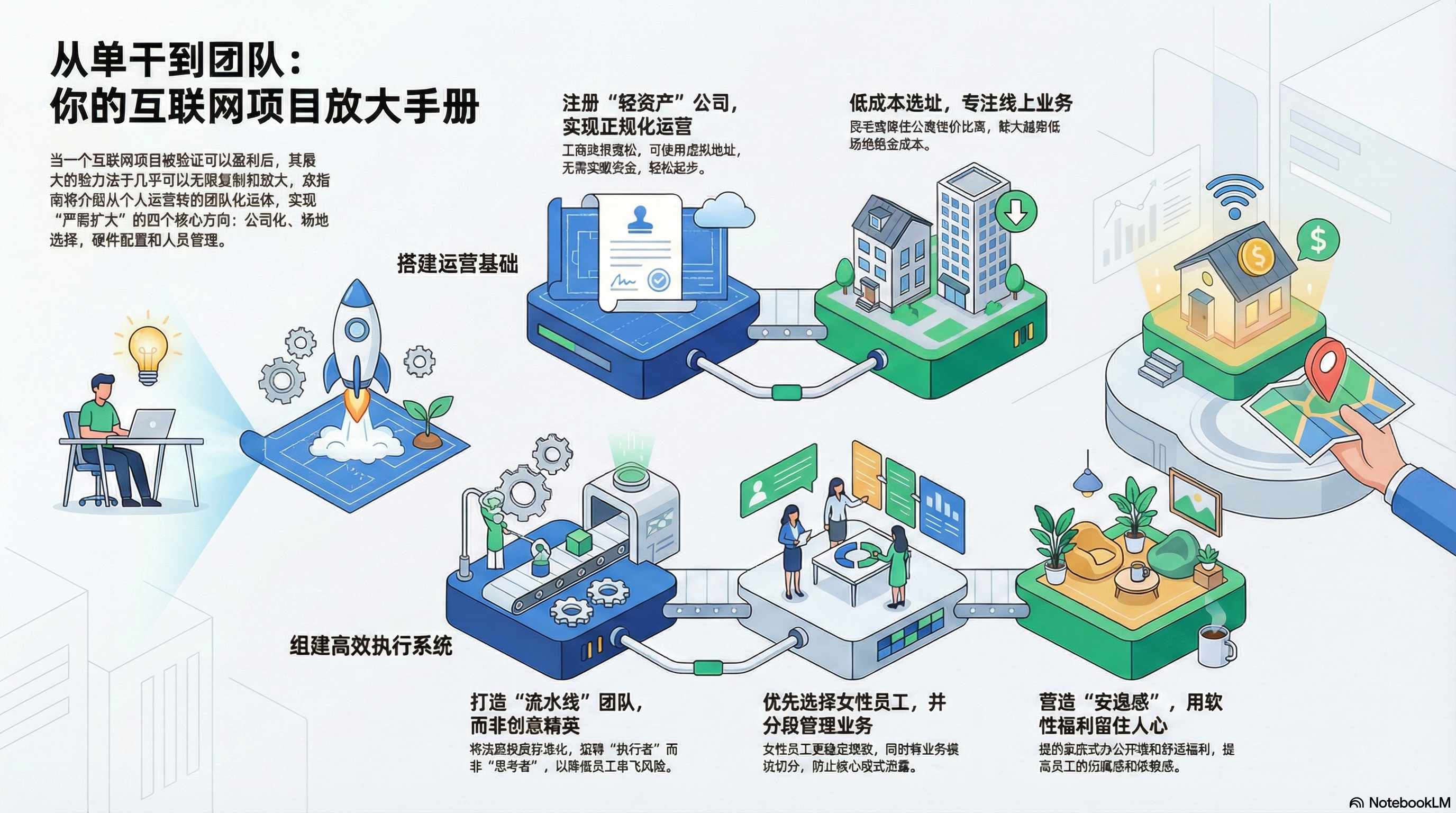 文件指出,互联网项目的魅力在于其巨大的放大潜力。一旦商业模式在小范围内得到验证,依托中国庞大的人口基数,几乎可以实现无限放大。实现这一目标的关键步骤包括:公司化运作、选择合适的场地、配置必要的硬件,以及最核心的人员管理策略。