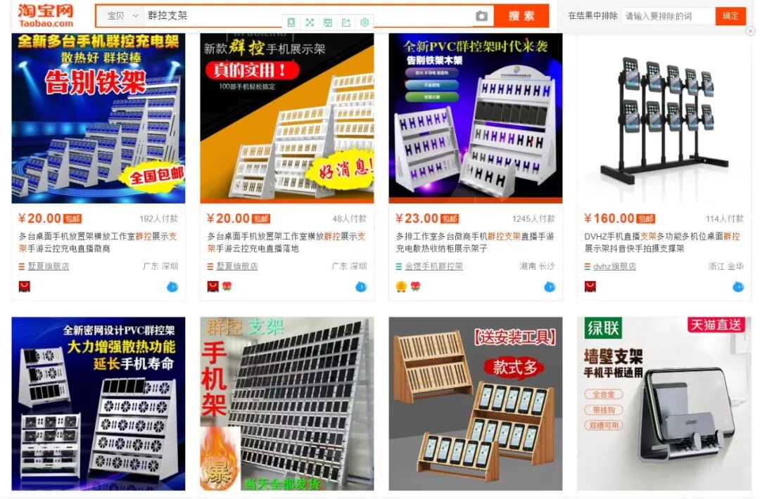 手机的放置收纳,淘宝搜 “群控支架”,出来一大堆: