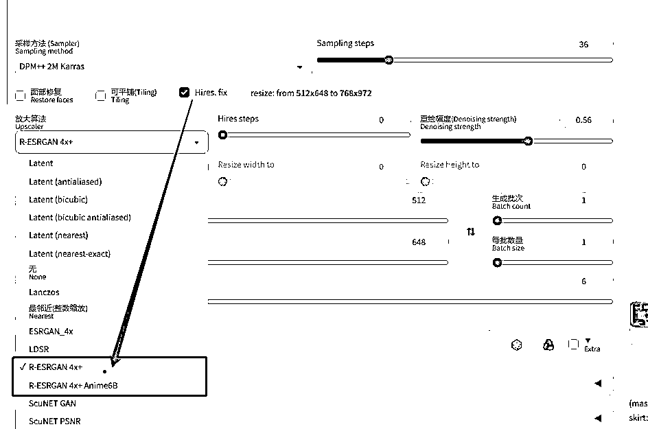 但是想要放大图像,可以启用高清修复,放大倍数默认*2,放大算法使用 R-ESRGAN 4x+,重绘幅度调整到 0.4,这里千万不能调的太高。