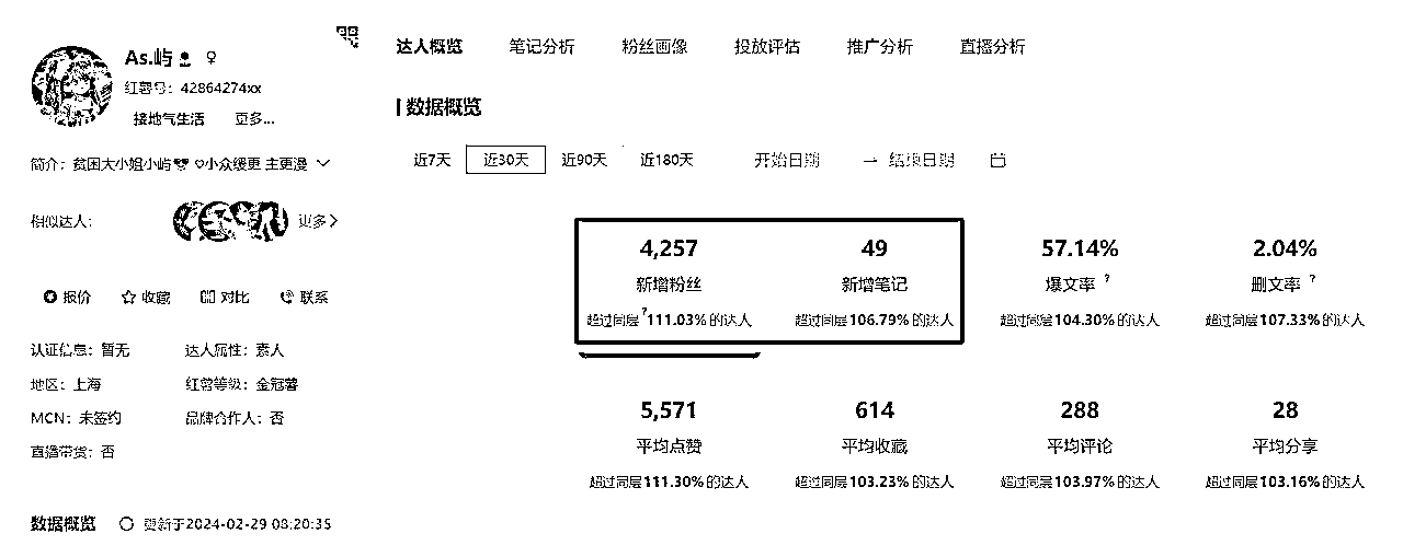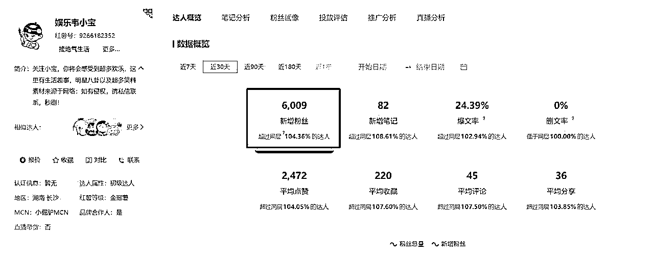 目前有很多广告商纷纷在小红书上面投放广告,但小红书很多达人是想做 IP 大号,不想接广怕损伤羽毛,所以千粉素人号现在入驻都能接到不少广告邀约,下图是各账号近 30 天数据。