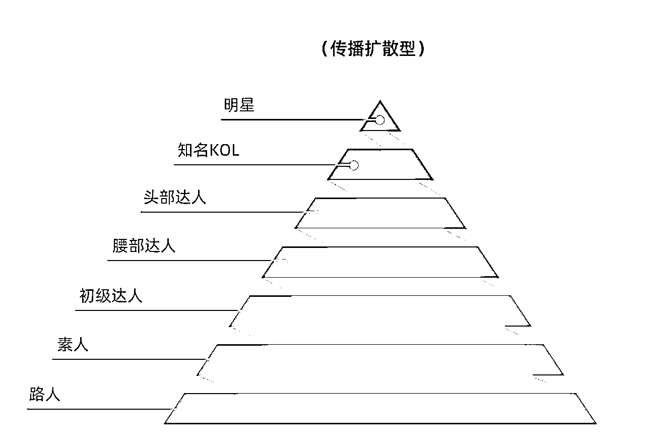 金字塔投放模型是符合 传播扩散原理 的达人投放模型。 通过明星社交造势,知名 KOL、头部达人带动话题,腰部达人专业评测种草,初级达人垂直扩散,素人、路人跟风效仿,自上而下形成完整的传播链路。