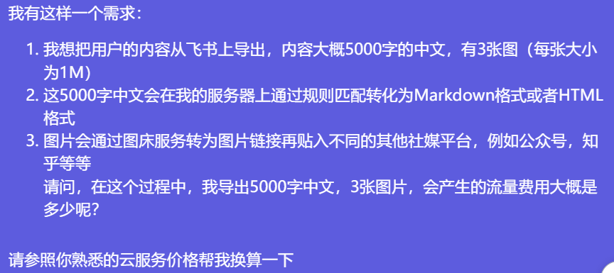 获取飞书文档的元数据,如通过服务器中转,以5000中文/次,3张图片/次,成本大约大约$0.00000008(通过GPT初步咨询,需后续校正)