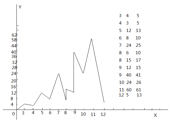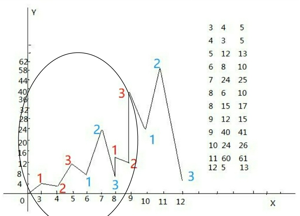 然后再将这十二组勾股数组代入坐标系,绘制出一张平面几何图:
