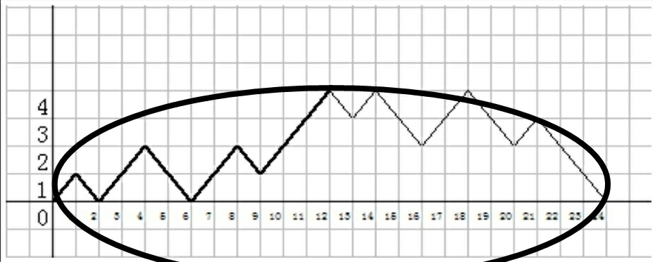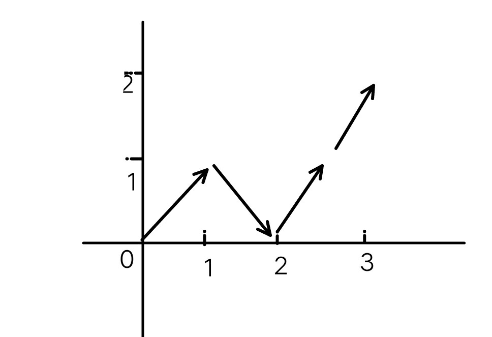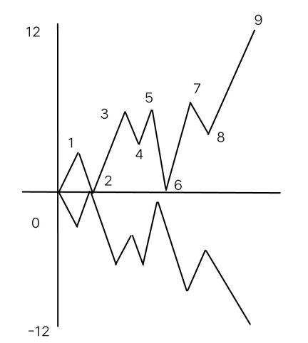 我们将这两组数在坐标系上表示,发现这个奇数可以分为两组奇偶数不平衡关系式。第一个关系式为三个奇数,一个偶数,第二个关系式为三个偶数,一个奇数。此时我们将这两个关系式在坐标图上画出,其中奇数为向上的线段,偶数为向下的线段。如图1-7所示。