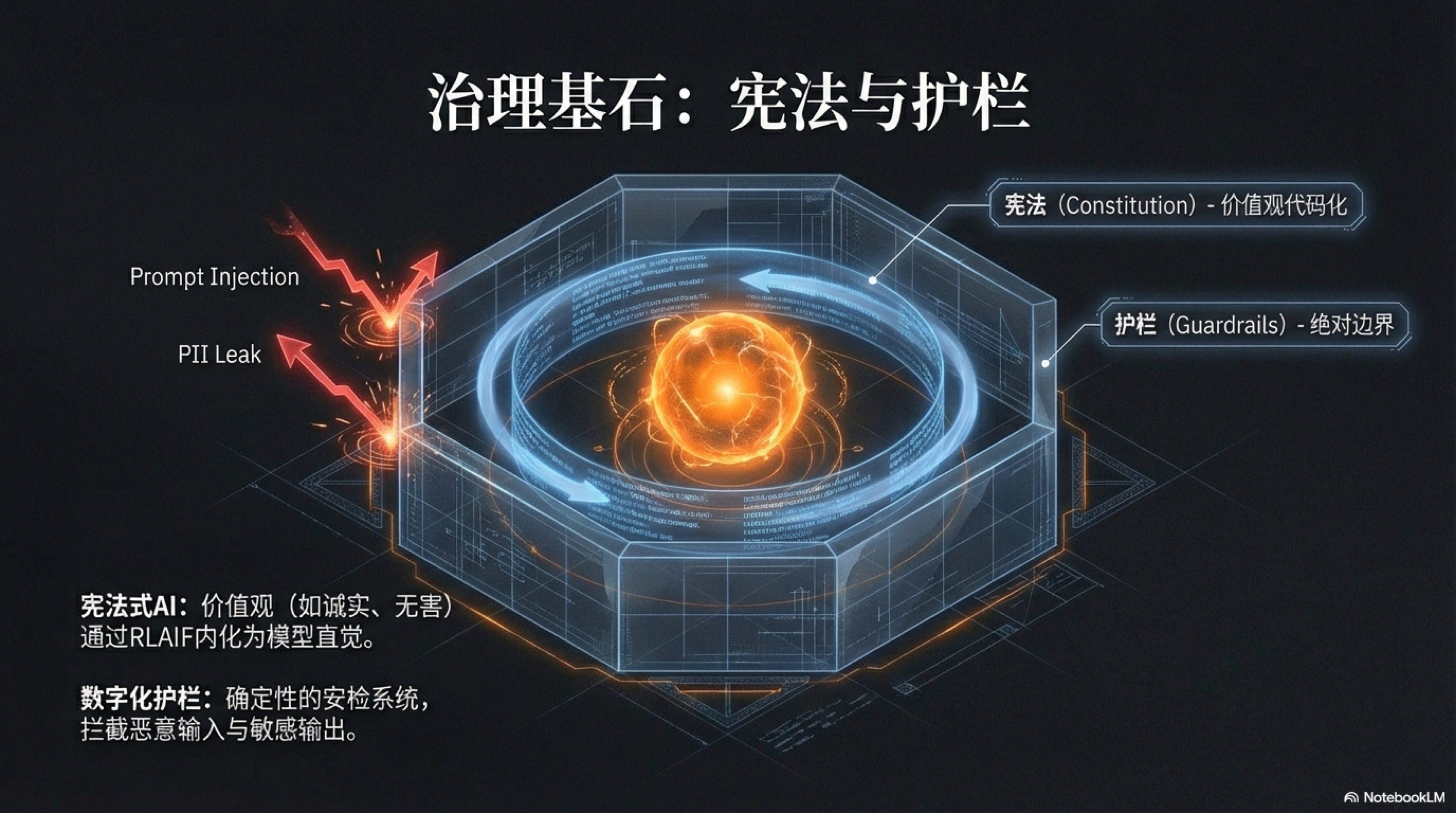 When millions of silicon-based employees run autonomously at nearly the speed of light, any tiny deviation can be infinitely amplified, eventually leading to catastrophic consequences. Therefore, while pursuing efficiency, we must establish a set of indestructible governance cornerstones, composed of two core components: an internal "Constitution" defining codes of conduct and values, and a set of external "Guardrails" ensuring the system never crosses the line.