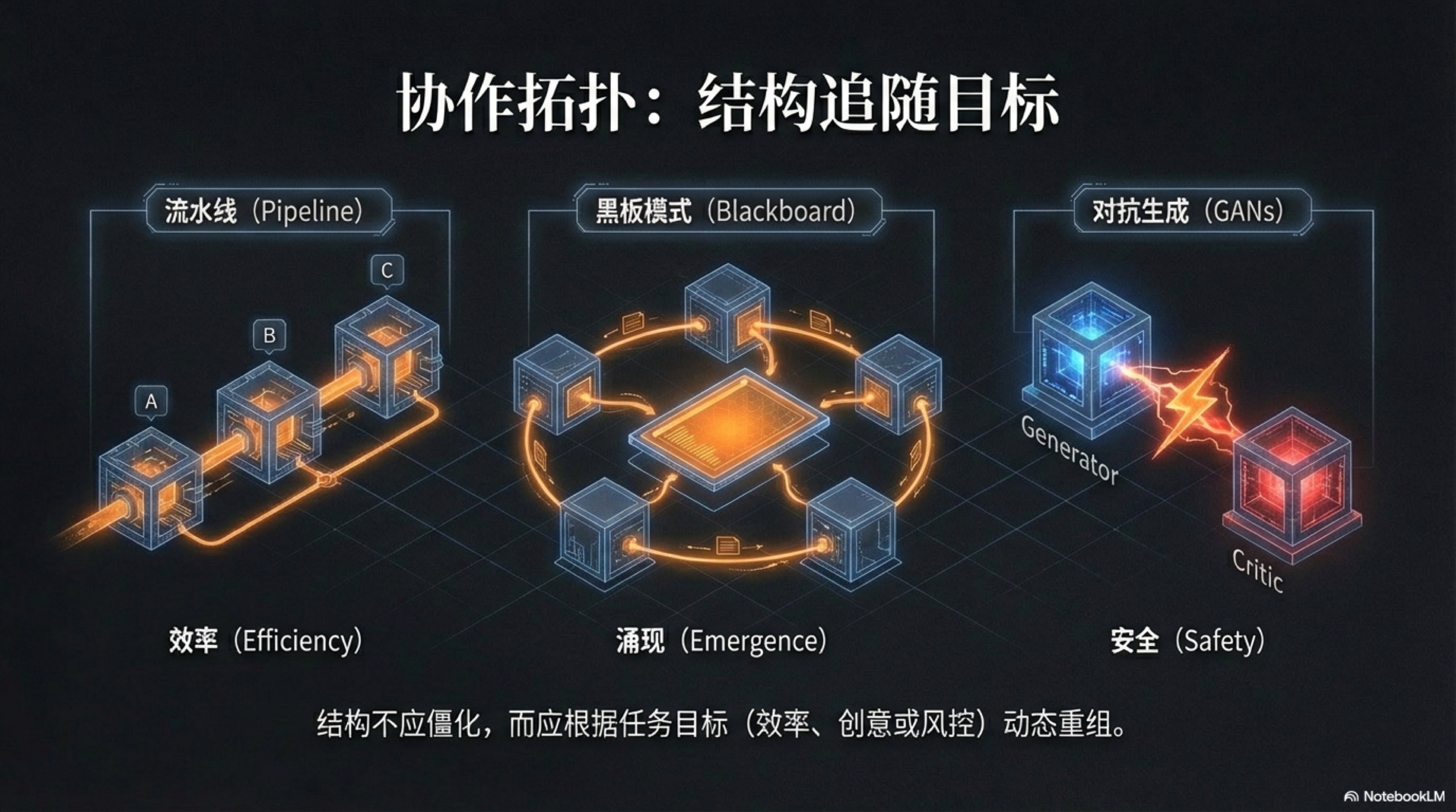 We no longer need to look for a universal, fixed organizational "shape," but dynamically and instantly build the most suitable collaboration "topology" according to the "objective function" of the current task—whether it is to optimize efficiency, stimulate creativity, or ensure safety. Just as water has no fixed shape and naturally fills the form of the container, the collaboration topology of an AI organization has no fixed pattern and will perfectly adapt to the intrinsic requirements of the objective function. This fluid design philosophy gives the one-person enterprise unprecedented organizational agility, enabling instant switching of "formations" between tasks of different natures to meet all challenges with the optimal posture.