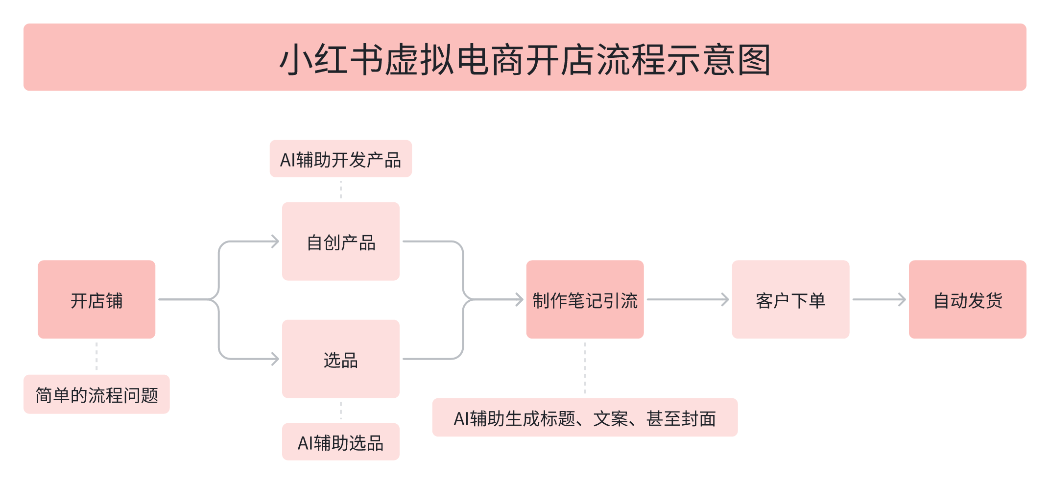 整个项目其实就五个流程【开店铺】【选品/自创产品】【制作笔记引流】【客户下单】【自动发货】