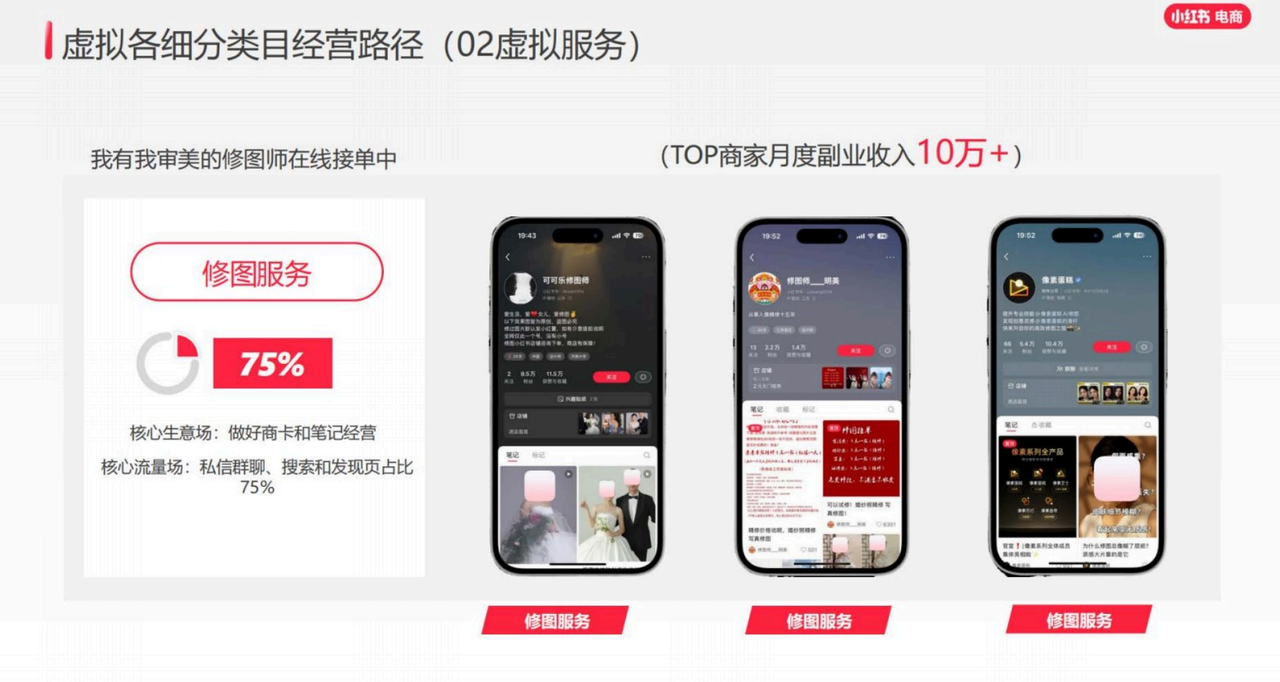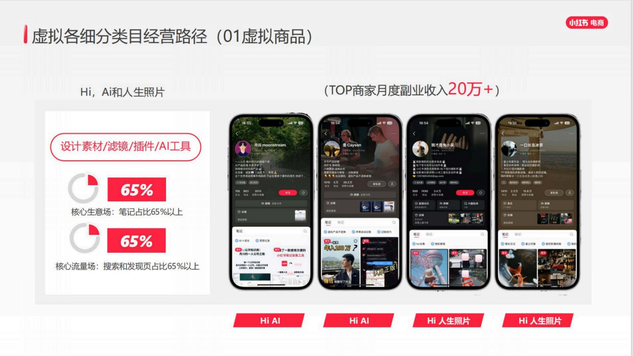 平台心智:小红书“人身照片的心智真的非常非常强” ,带动需求。Top 商家月入 20 万+。
