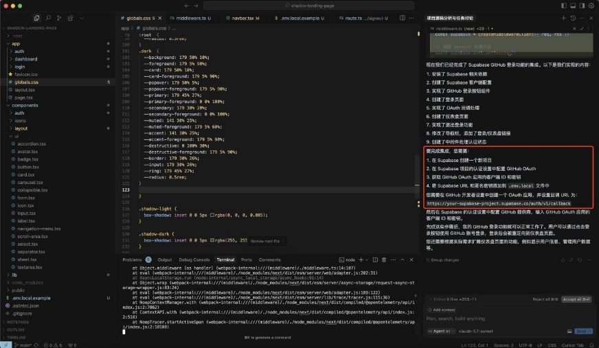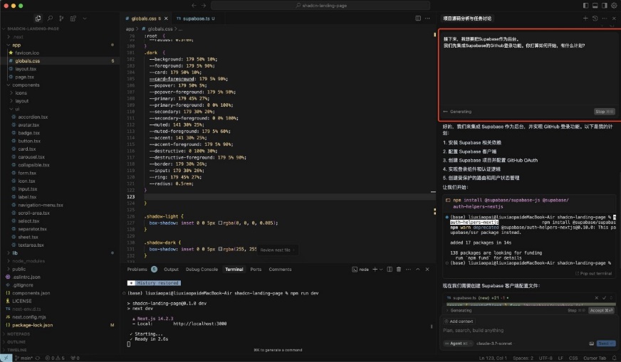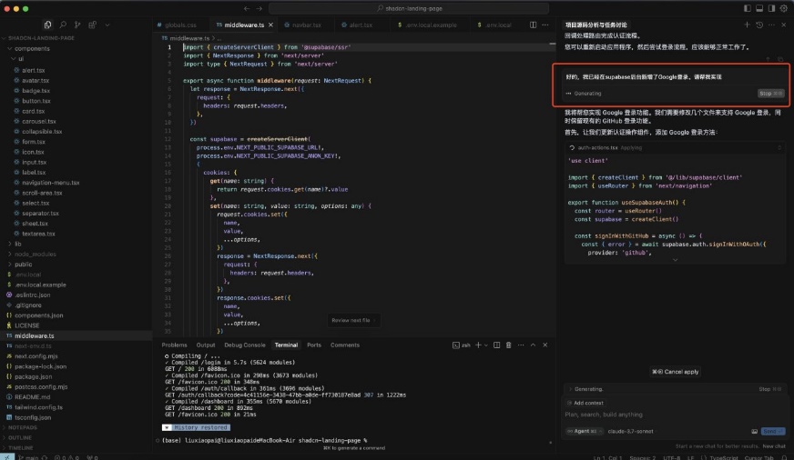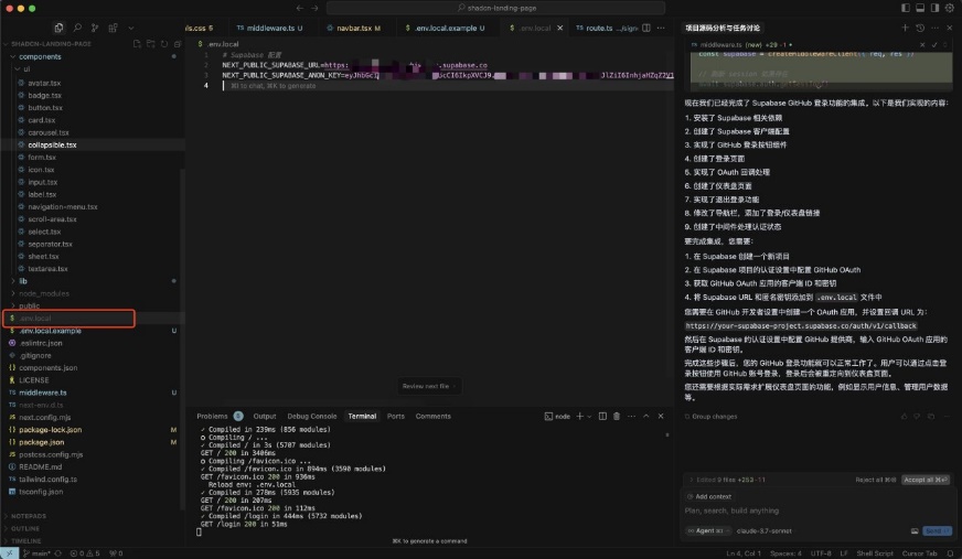 Note: It is recommended to tell Cursor, "Supabase official recommends using @Supabase/ssr package for server-side authentication, do not write it as client authentication"。(I did not show this in the screenshot, but it is recommended that you add this sentence.)