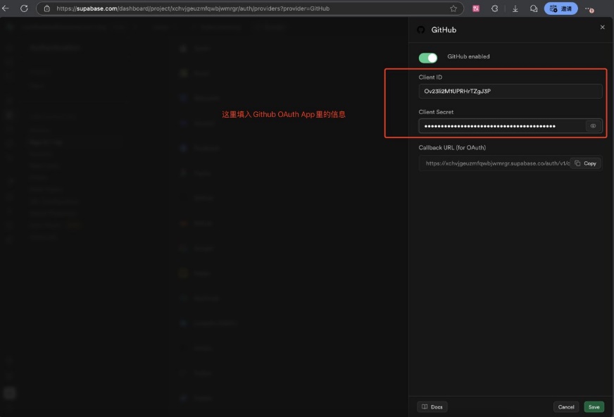 After GitHub configuration is completed, fill in the Client ID in Supabase