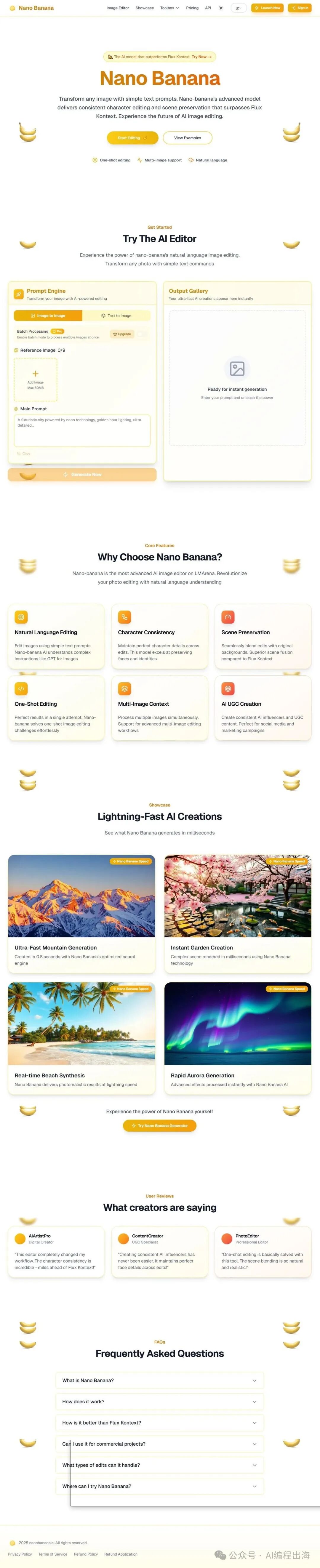 第二个网站是近期因为Nano-Banana而爆火的网站 nanobanana.ai,首页顶部Hero区域同样是放着一个图片生成器,底下同样是围绕这个产品的内容;