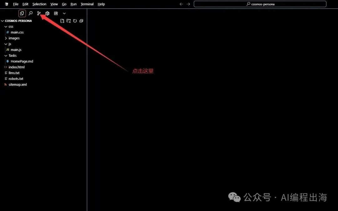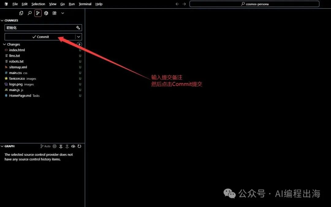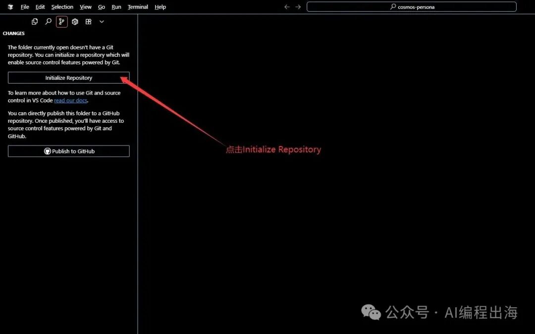 在Cursor中打开我们前面修改好的项目,点击进入Git窗口,点击“Initialize Repository”初始化仓库,输入提交时的备注信息,然后点击“Commit”提交。
