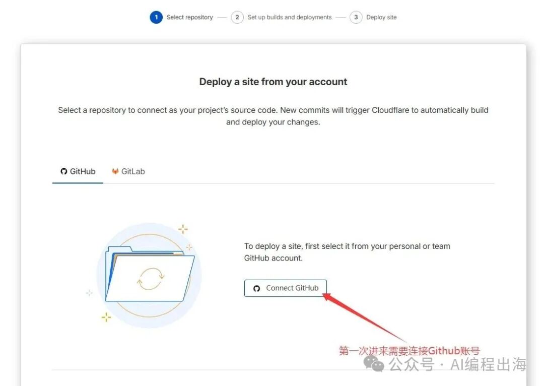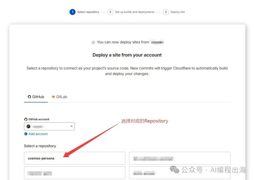 首次需要先连接你的Github账号,连接成功后,选择你的项目对应的Repository。