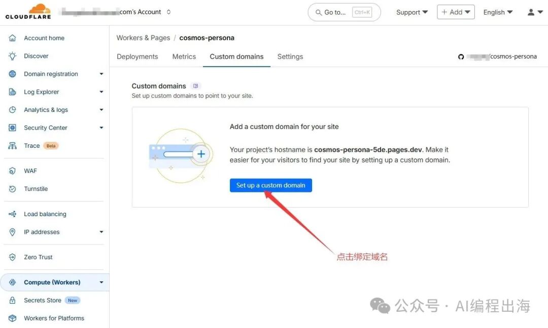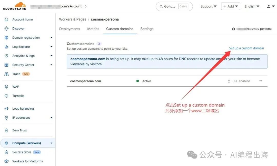 接下来点击右上角“Set up a custom domain”添加带www的二级域名: