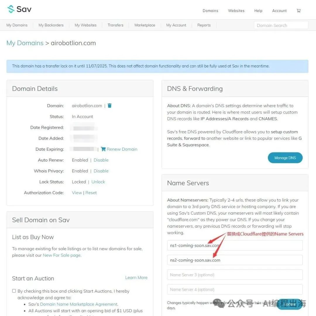 Sav.com:进入对应域名的管理页面,在“Name Servers”板块中,把前面两行Sav提供的默认Nameservers修改成Cloudflare提供的两个Nameservers,然后点击“Update”保存。
