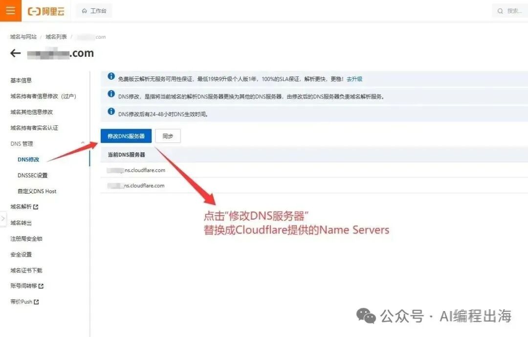 阿里云:进入对应域名的管理页面,点击左侧菜单“DNS 管理”中的“DNS修改”,点击“修改DNS服务器”,输入Cloudflare提供的两个Nameservers,保存即可;