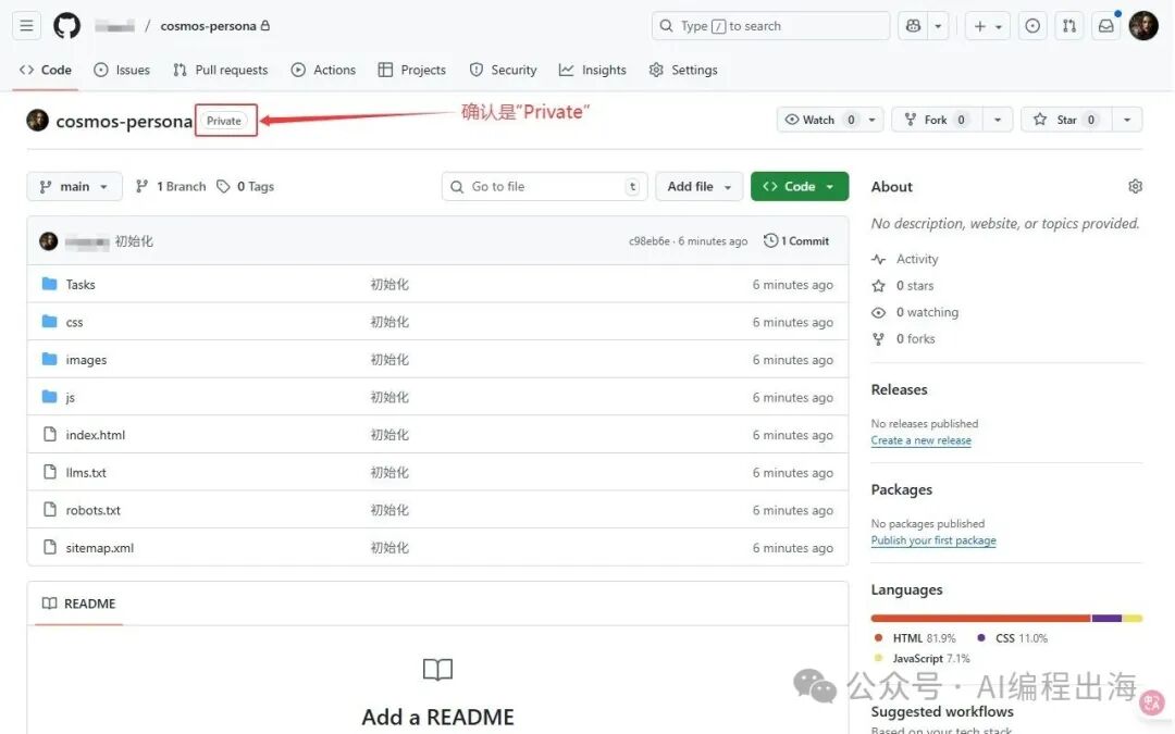 提交成功后收到提交成功的提示。回到Github对应账号下查看这个项目,确认一下这个项目设置为“Private”没有公开。