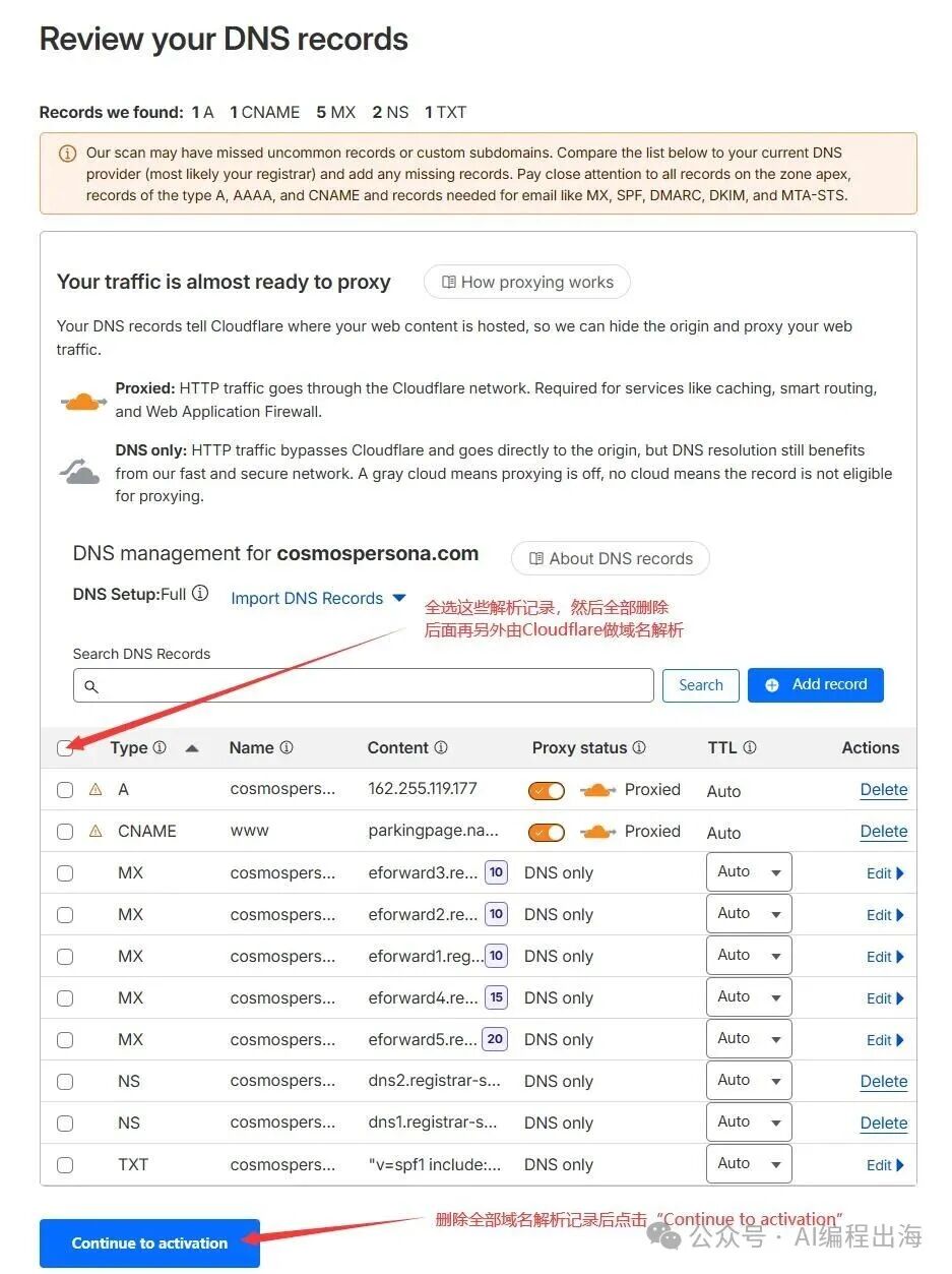 选择免费套餐后,进入“Review your DNS records”页面,可以看到我们的域名原来的解析记录。由于我们要新上一个网站,因此删除所有这些解析记录(如果存在你的其它网站和项目需要用到的解析记录的话,请保留那部分记录)。