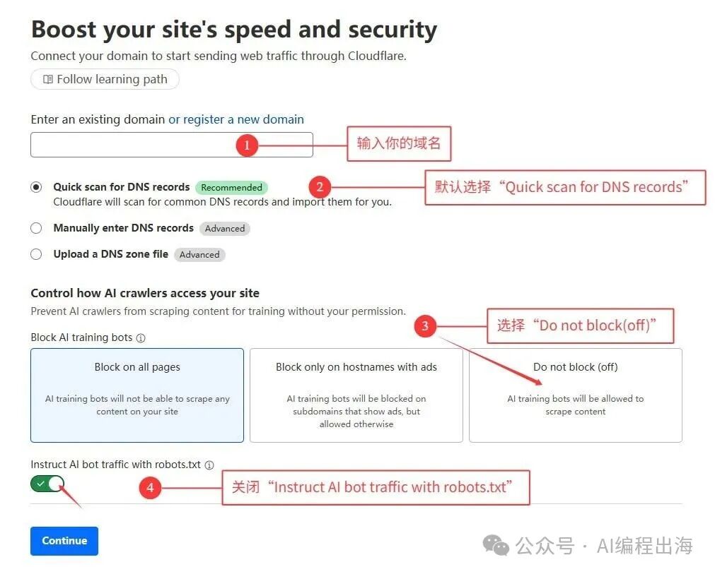 输入你的网站域名,默认选择“Quick scan for DNS records”(除非你有明确的自定义需求时才使用“Manually enter DNS records”或“Upload a DNS zone file”);