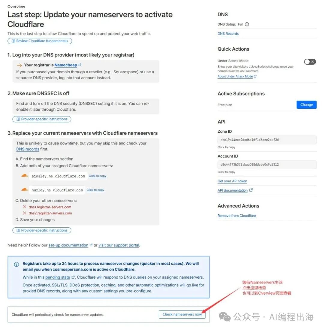 回到Cloudflare页面,等待Cloudflare的Nameservers生效。