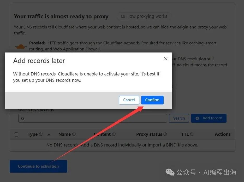 点击“Continue to activation”,提示现在没有解析记录,可以后续再添加,点击“Confirm”即可。