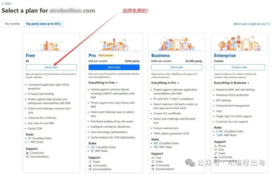 选择免费套餐。一般情况下,免费套餐已经足够使用,给我们的网站提供了必要的“护身符”:不限量 L7 DDoS 防护、基于 IP 的限流、WAF 保护高危/广泛漏洞、检测并挑战常见机器人、通用免费 SSL 证书、快速、易用的权威 DNS和全球 CDN 加速。这也是Cloudflare被业界称为出海网站“活菩萨”的原因。