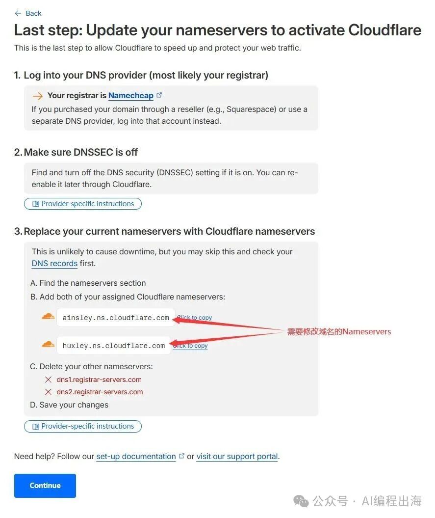 Cloudflare给我们提供了两个Nameservers,我们需要回到我们注册域名的域名商网站中把Nameservers改换成Cloudflare提供的Nameservers。