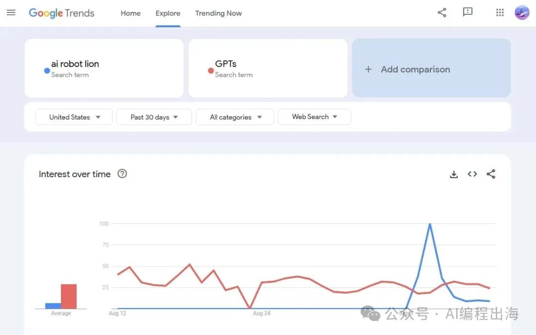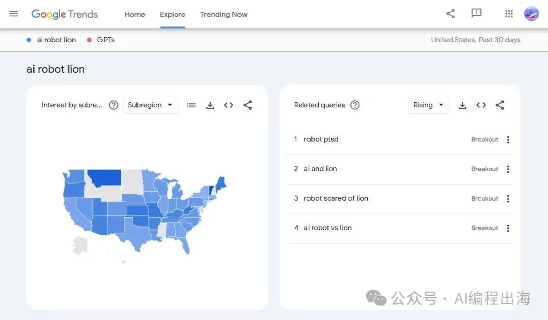 我们以上周在Tiktok突然火了一下的“AI robot lion”为例。这个词不建议大家去做,这种词是在社媒中突然爆火,热度不一定能持久,这个词仅热了两三天,热度就下去了,不像前不久的另一个词“Wplace”那么火爆,因此,这个词仅仅是作为本次分享随便找的一个例子。