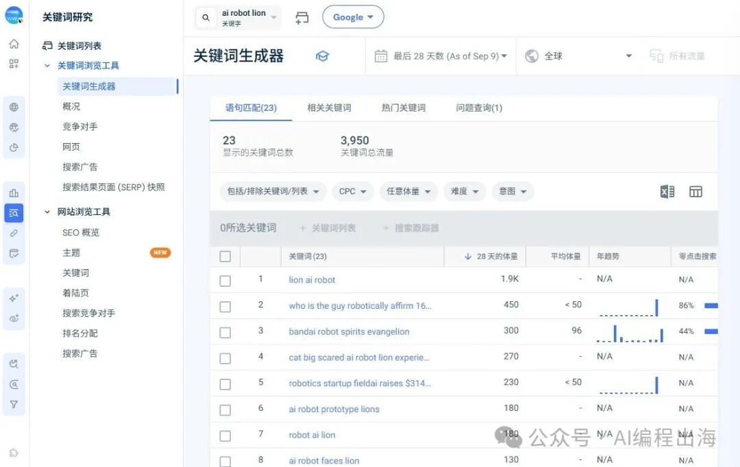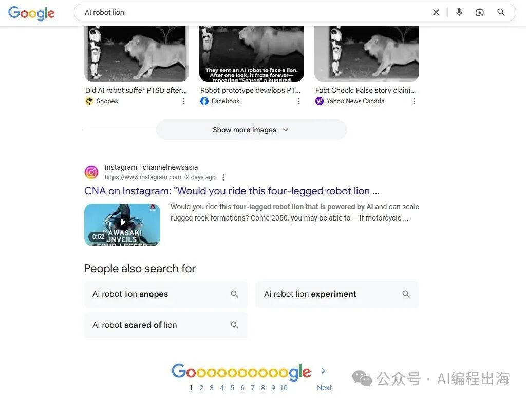 查询之后,选择和我们这个关键词和切入点相关的关键词,比如:Ai robot lion snopes, Ai robot scared of lion, Ai robot lion experiment, ai robot lion dance, lion ai robot