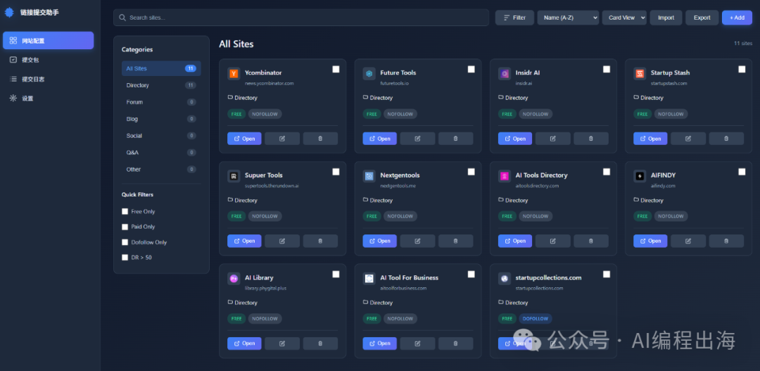结果,第一版Claude Code就给出一个界面相当美观并且可以添加网站的版本。后面我继续让Claude Code做了一些优化,包括增加更多网站提交字段、完善数据导入导出、实现在提交页面获取CSS选择器或Xpath、增加卡片显示样式等等,最终,半天不到,Claude Code帮我完成一个简单的外链提交插件: