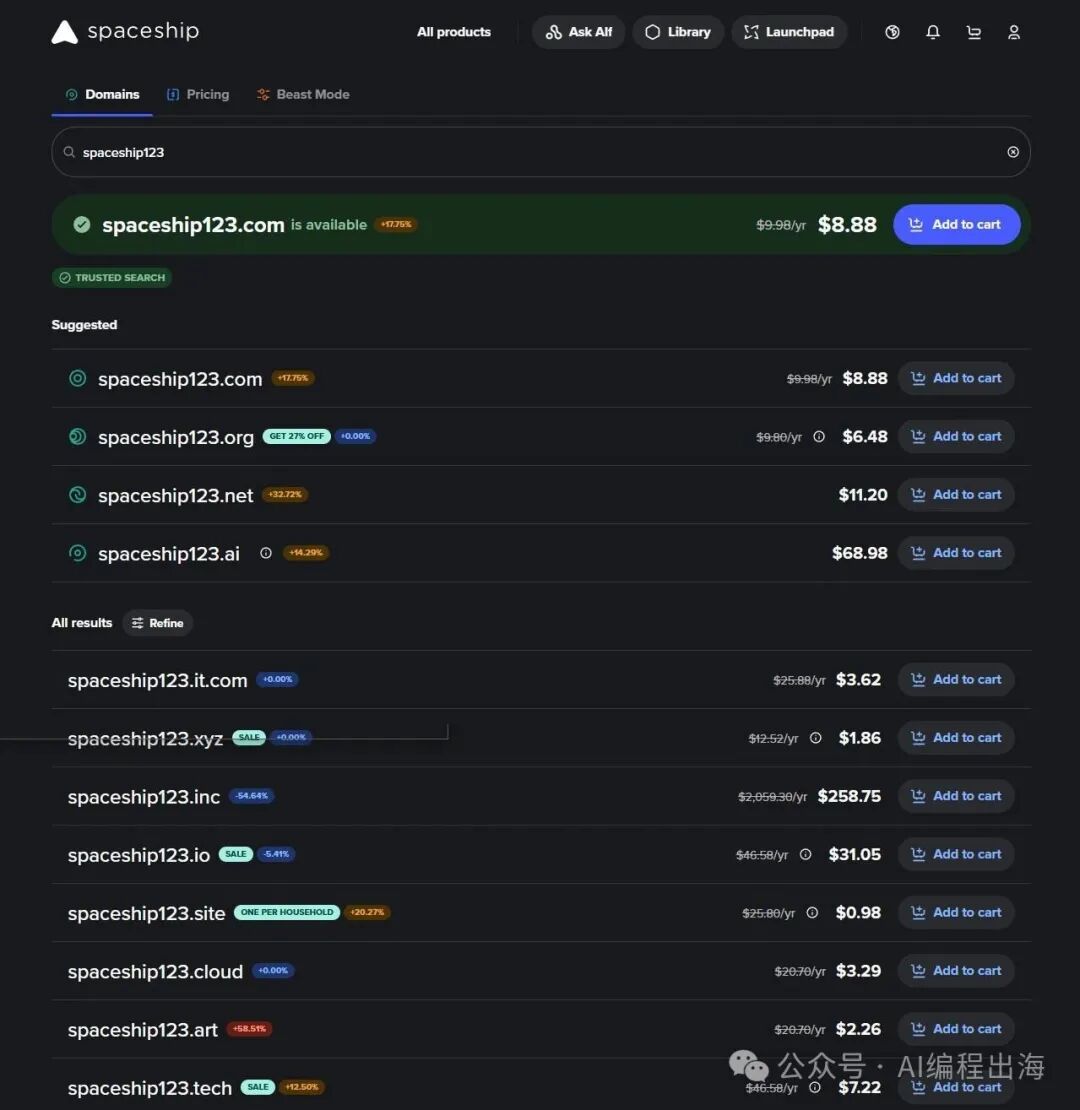 很多域名在spaceship上的价格比阿里云、Namecheap、SAV都要便宜。尤其是.ai域名,注册只需68.98美元,比Namecheap上的89.98美元足足便宜了21美元。.com、.org、.io等域名注册价格也比其它平台略有折扣。虽然优惠的金额看似没多少,但是对于我们每天都在挖掘关键词和经常注册域名的出海开发者来说,也可以省下不少费用了。
