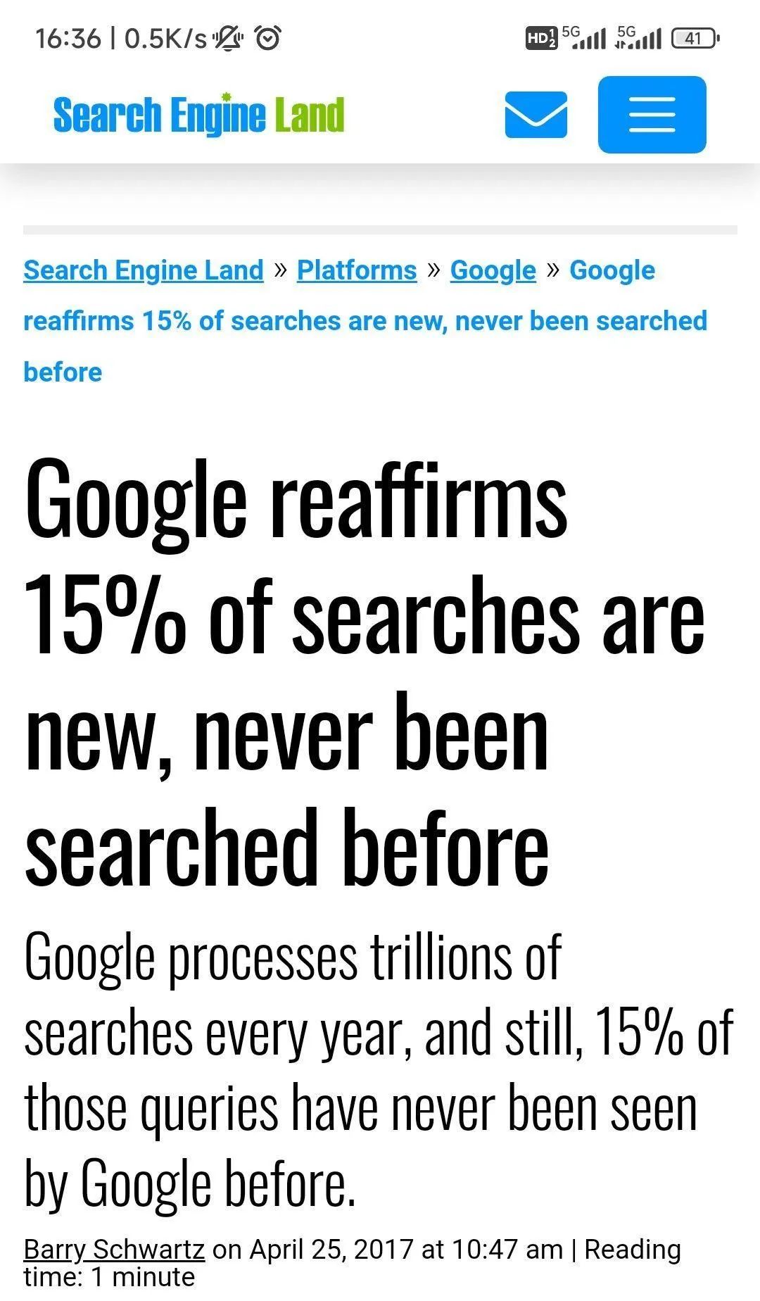 谷歌每天处理的搜索中有15%是从来没有被搜索过的词。
