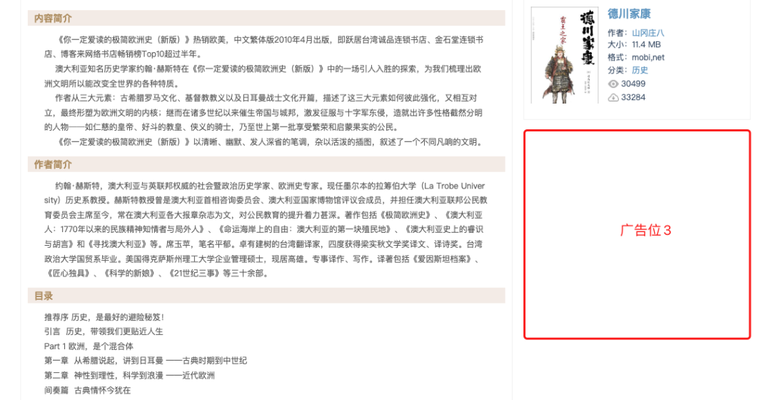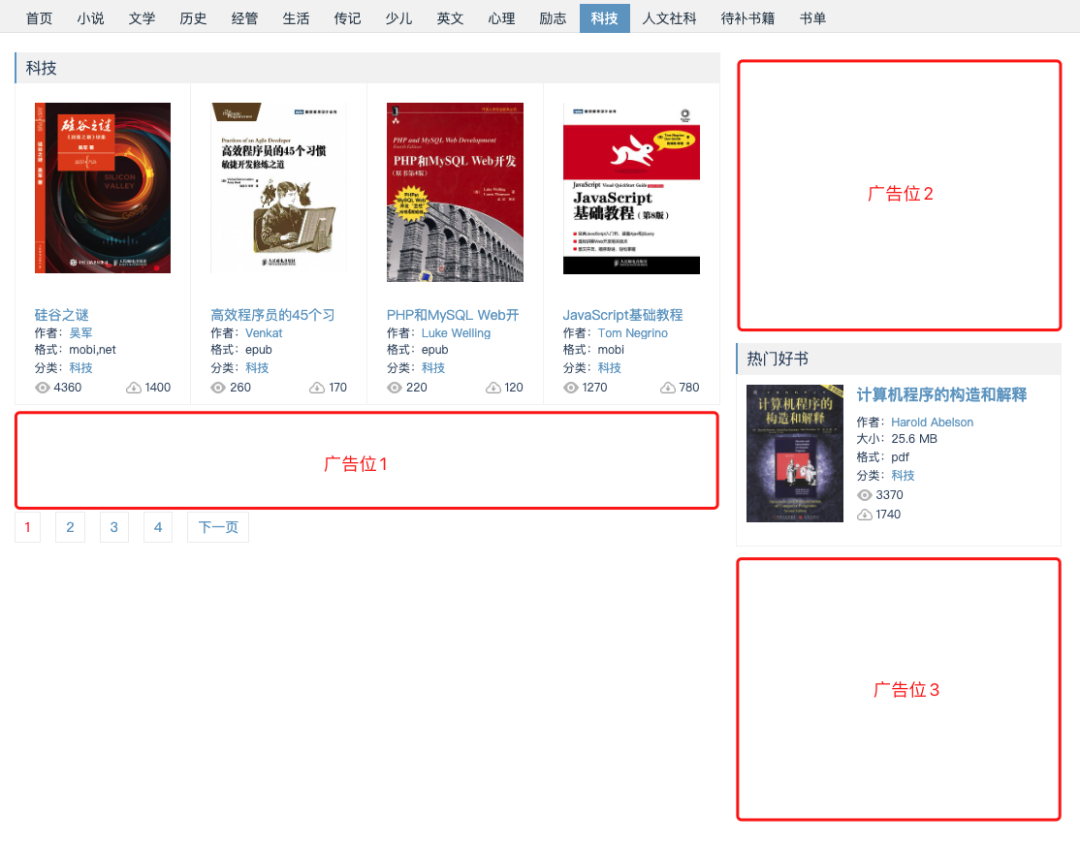 改版后的网站如下,可以看到 变漂亮了, 书籍列表页 面改成卡片式,一行放了4本书,还 增加了书籍封面 ,也增加广告位了,一页放了3个广告位 。