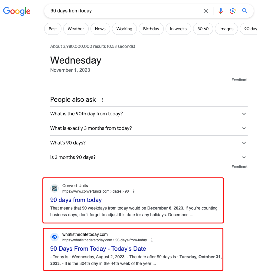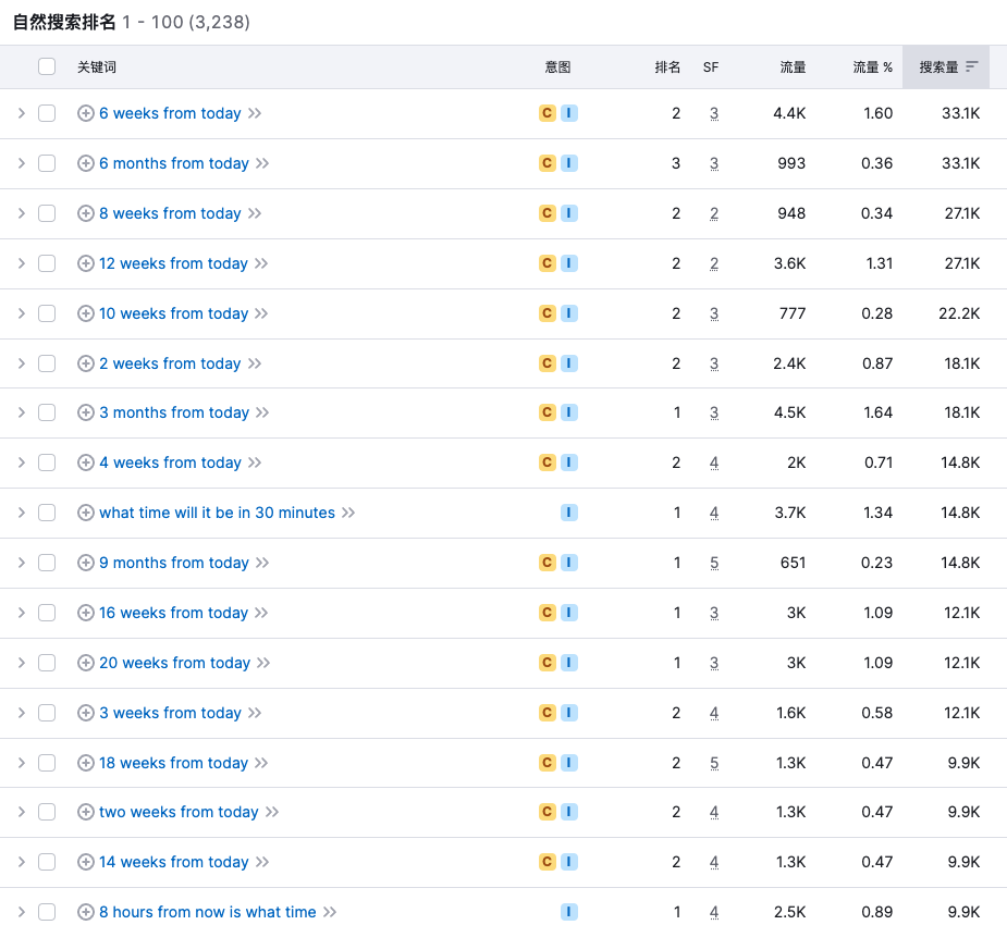 我们还可以去 Semrush 按照关键字搜索量倒序看看,有些词搜索量挺大的,如“90 days from today”有165K的搜索量,不过这个网站只排到了第15名。
