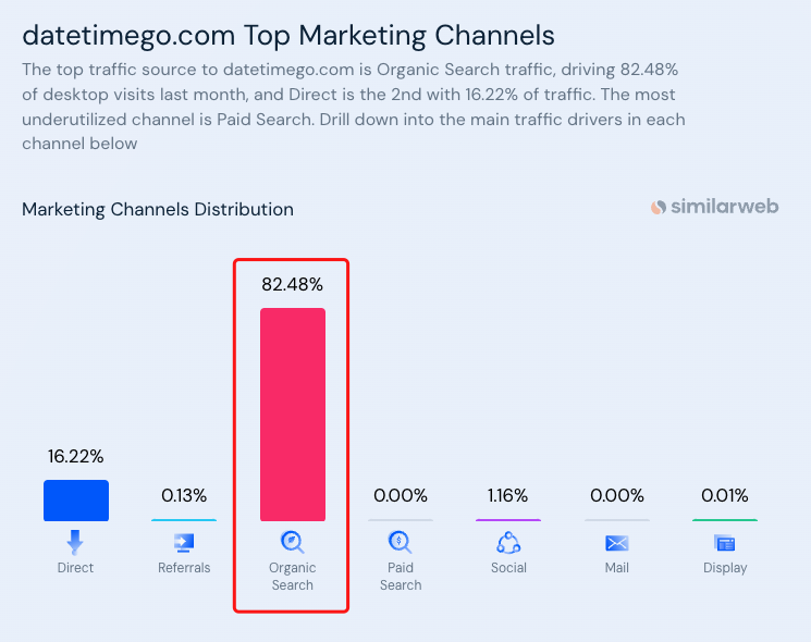 再看下流量来源,82%的流量来自于搜索引擎。这说明什么?说明这个网站的SEO策略是有效的,并且是谷歌认可的。