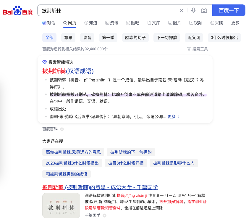 为什么会估高呢,看看下面就知道,在百度搜索“披荆斩棘”,的确这个网站排到了第一名。但是,注意这里有个但是,成语类搜索结果,百度直接用框计算给显示出来了,大多数人搜索这个词,看到上面的“搜索智能精选”就会直接点进去了,只有少部分人会点击下面真正的第一条结果。