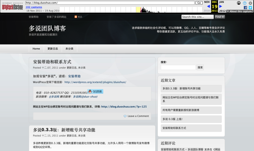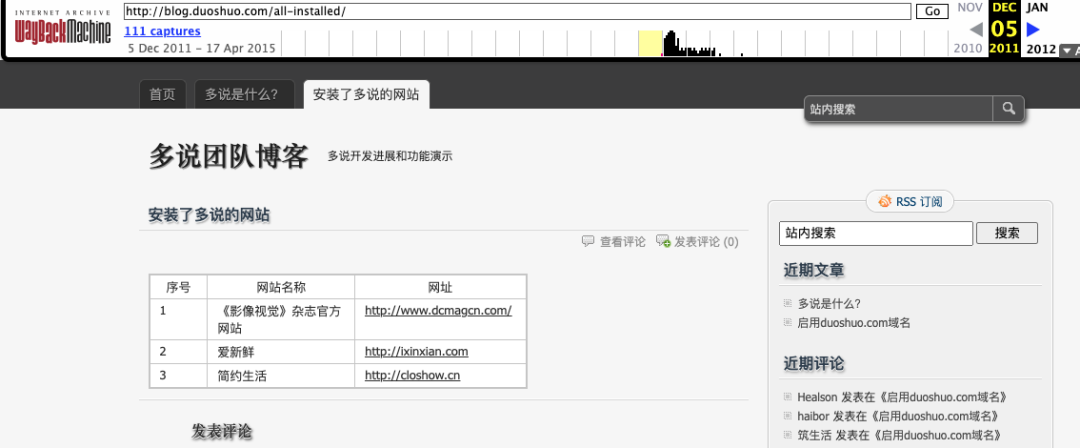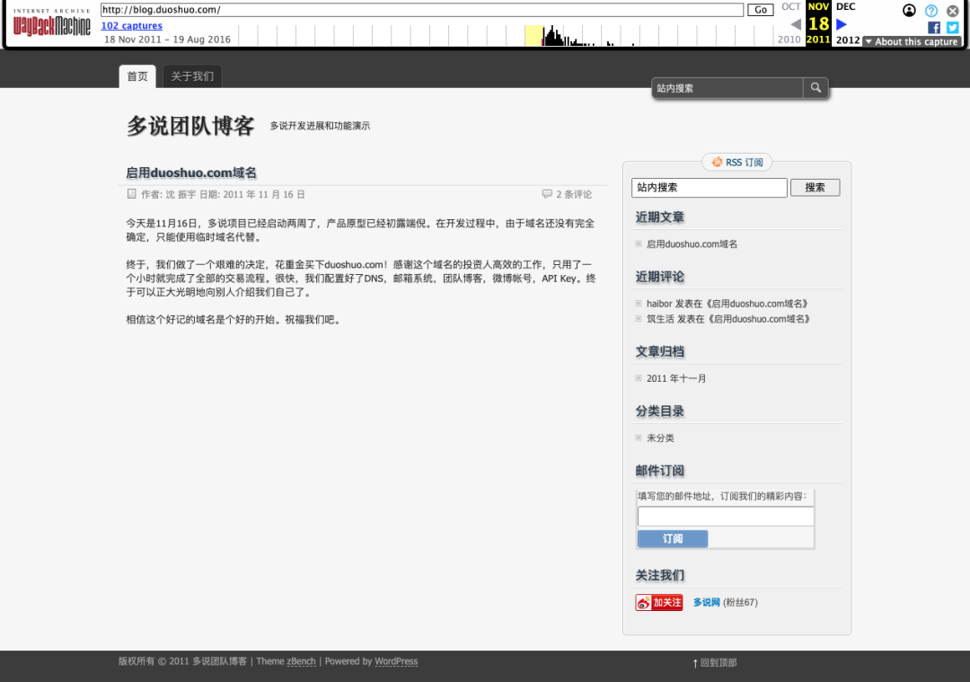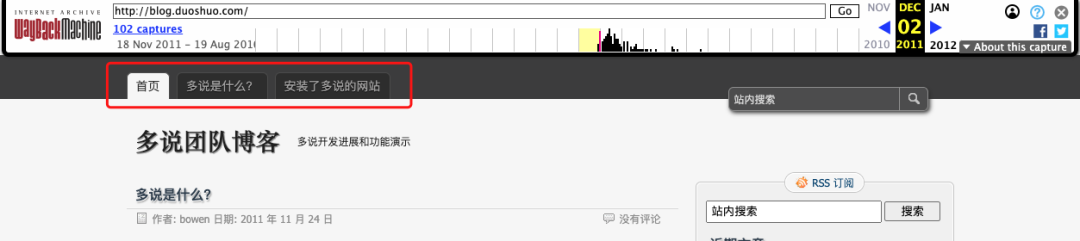 可以看到,实际上多说第一版是用Wordpress博客作为官网首页的,第一篇博文发布于11月16日,但是2天之后,也就是11月18日才被 archive 收录。