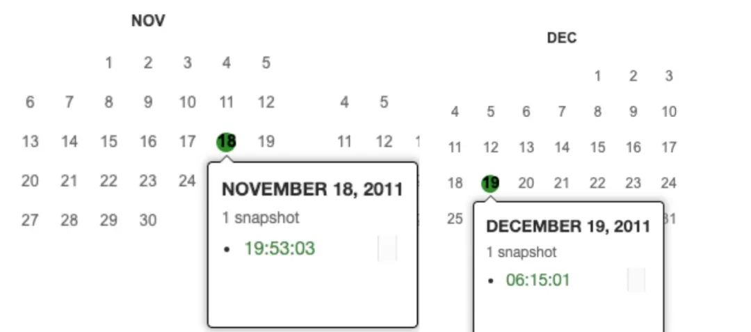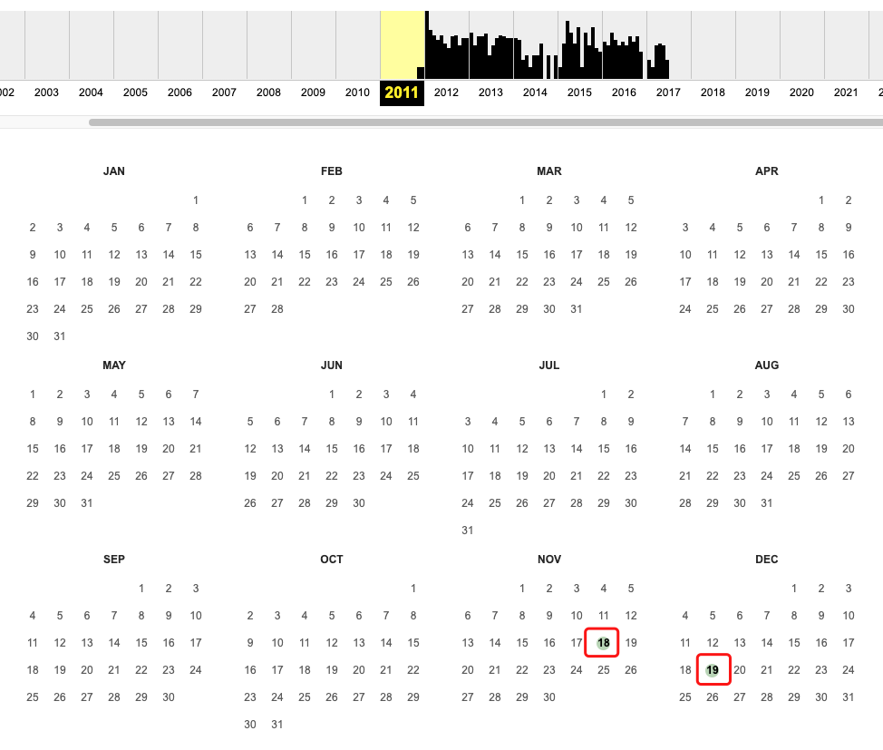 现在,我们点击2011年,会看到,这一年,只收录了2次,一次是11月18日,一次是12月19日。