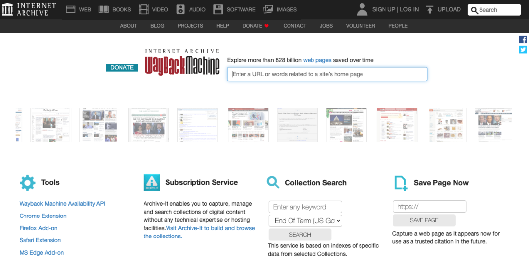 注意搜索框上面这句话,archive 已经收录了8280亿个网页了,不愧是互联网档案馆。