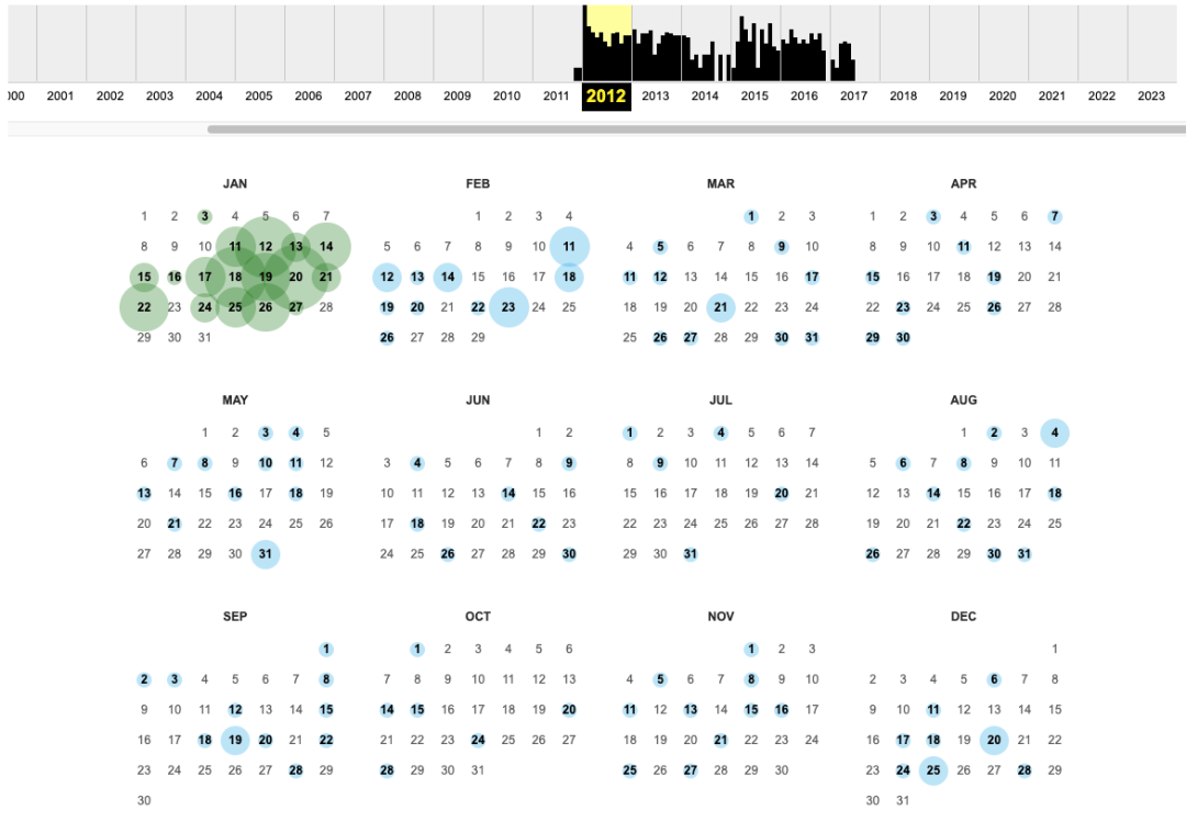我们回到 archive 的 Calendar界面,看下2012年的收录就更频繁了。同一天,收录次数越多,圆圈直径越大,颜色也会不同,根据这个就很容易判断哪些天收录多。